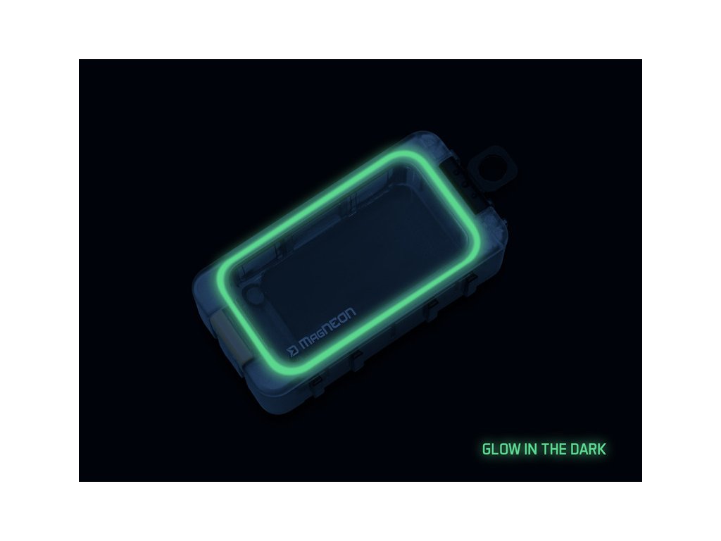 Delphin MagNEON je plně vodotěsná, což zaručuje spolehlivou ochranu uloženého obsahu před vodou, vlhkostí i nečistotami. Po obvodu je vybavena gumovým těsněním, které pevně přiléhá k víku a zabraňuje pronikání vody i za deště nebo manipulace ve vlhkém prostředí. Toto těsnění je navíc fosforeskující, takže krabičku snadno naleznete i za zhoršených světelných podmínek.