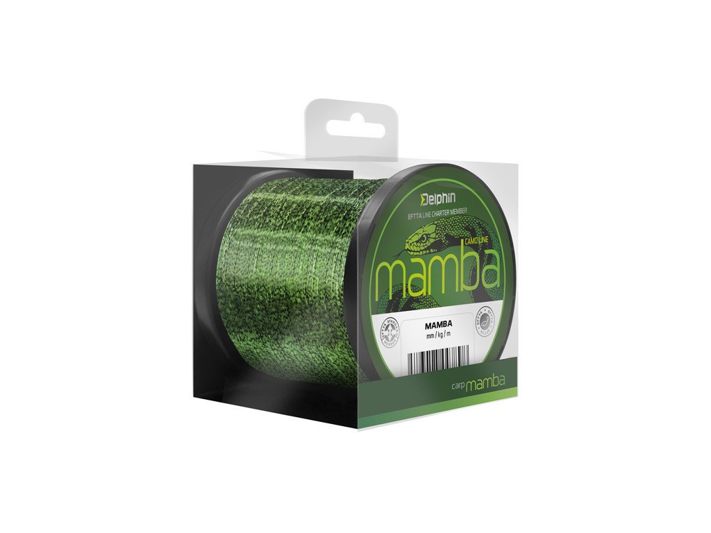 Excelentní kaprařský vlasec s unikátním 3D vzorem. MAMBA disponuje vynikajícími vlastnostmi jako pevnost a nosnost v uzlu. Díky svému jedinečnému kamuflážovému provedení rychle splyne s okolním prostředím. Jeho pevnost a odolnost vůči oděru ho předurčují k použití i do náročných podmínek a jeho mimořádně hladký a jemný povrch umožňuje využití při dalekém nahazování. Díky těmto vlastnostem je Delphin MAMBA považován za univerzální kaprařský vlasec, který splňuje ty nejnáročnější požadavky, a na který se můžete spolehnout v každé situaci.