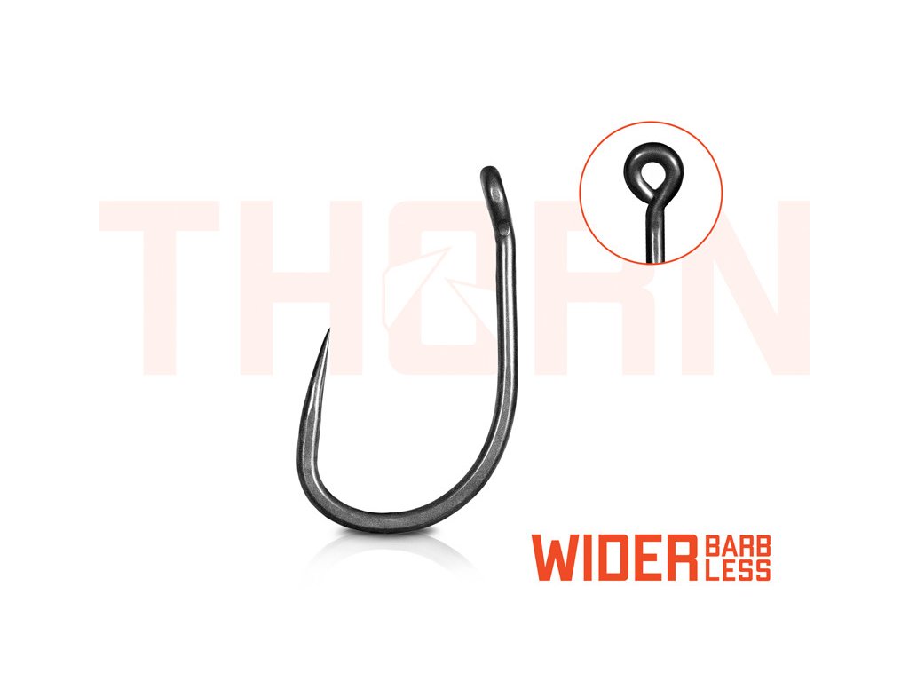 THORN Wider BarbLESS je specifický svým přímo již legendárním tvarem typu wide gape. Jde o háček charakteristický širším obloukem a rovným ramínkem. Díky těmto parametrům jde o velmi univerzální a spolehlivý háček, který je možné využít při různých návazcích a nástrahách. V tomto případě háček nedisponuje protihrotem, díky čemuž pronikne do kapří tlamy mnohem snadněji.