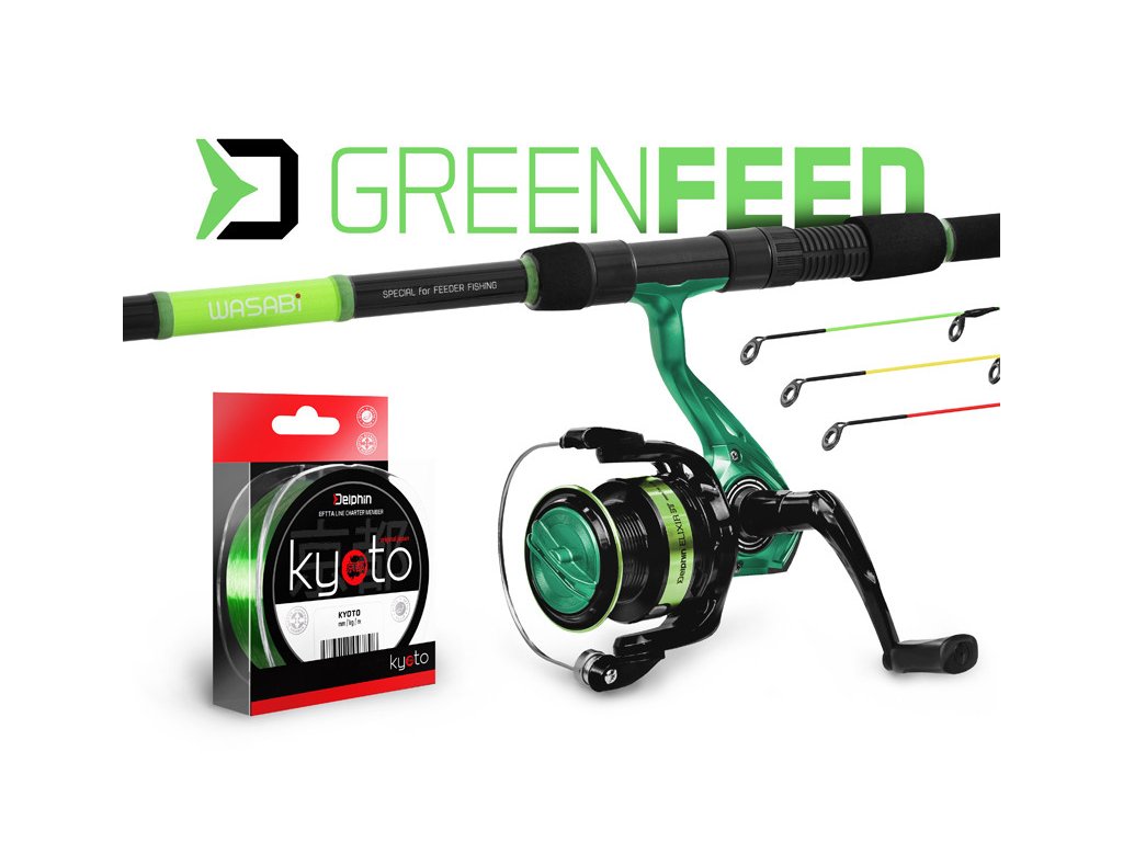 Pokud se neumíte rozhodnout, jak si zkombinovat spolehlivou feederovou sestavu, tak přesně pro vás je zde feederový set Delphin GreenFEED. Set se skládá z třídílného prutu Delphin WASABI Feeder NXT, blank je vyroben z ideálního poměru kompozitních materiálů. Rukojeť z EVA pěny padne do ruky při zdolávání i nahazování. Akce prutu je příjemná a bonusem jsou očka s keramickou výplní. K prutu jsou samozřejmě přibaleny také tři náhradní špičky (1x Light, 1x Medium, 1x Heavy). Svým zeleno-černým provedením dokonale zapadne do setu naviják Delphin ELIXIR. Tělo z lehkého kompozitního materiálu zaručuje dlouhou životnost. Kuličková ložiska v počtu 3+1 spolu s převodovým poměrem 5,0:1 a mechanismem s vyváženým rotorem zaručí tichý a plynulý chod s důkladným ukládáním vlasce. Kapacita cívky je dostatečná k dané rybolovné technice, při průměru vlasce 0,18mm se vejde na cívku až 275m vlasce. Samozřejmě, aby byl set kompletní, tak nesmí chybět vlasec KYOTO s minimální roztažností, což vám zaručí rozeznat záběr i u těch nejopatrnějších ryb. Feederový set potěší široké spektrum rybářů, kteří se věnují rybolovné technice feeder.