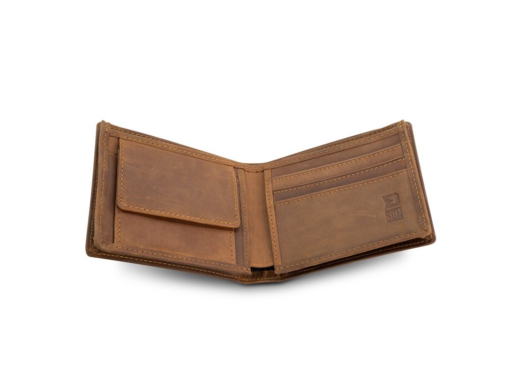 Peněženka je vyrobena z pravé kůže tmavě hnědé barvy, díky čemuž se vyznačuje kvalitou, odolností a příjemně se drží v ruce.