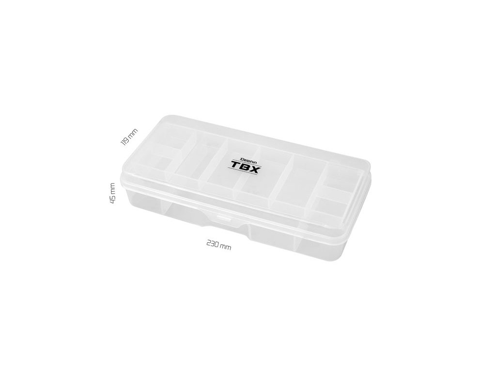 TBX ONE je řada multifunkčních krabiček určených pro uložení rybářského příslušenství. Vyrobené jsou z transparentního plastu, takže máte vždy dokonalý přehled o uložených věcech uvnitř krabičky. Řada TXB ONE je vybavena praktickými klipy z transparentního plastu. Technické parametry: Rozměr: 230x119x45mm Počet pevných přihrádek: 11 Rozměr přihrádky: 1x (13,5x10,1x1,8cm), 2x (4,2x10,1x1,8cm), 4x (3,5x6,8x1,5cm), 4x (3,5x3,5x1,5cm) Počet vkladatelných příčníků: 0