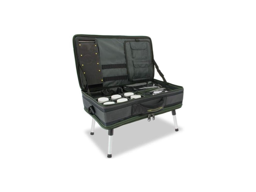 Velice povedený, kvalitně zpracovaný kufřík s integrovaným stolkem. Stolek lze z kufříku vyjmout, tím získáte klasický stolek do bivaku a kufřík na vše nezbytné. Velmi robustní zpracování a kvalitní zipy. Už nikdy nebudete hledat potřebné vybavení všude po bivaku. Vše je přehledné a na jednom místě. Má vydatné polstrování jak uvnitř kufru, tak na poutku a popruhu přes rameno. Spousta možností jak vnitřek kufříku individuálně upravit a nastavit. Ideální na delší výpravy pro kapraře do bivaku.