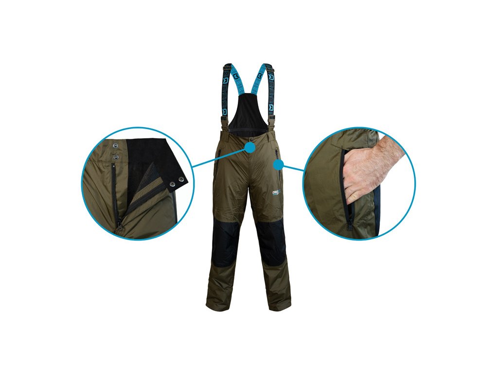 Jednou z hlavních výhod nohavic je vyvýšený pas v oblasti křížů, čímž bude spodní část vaší zad dokonale chráněna. V oblasti hýždí a kolen se nachází zesilená černá látka, jejímž úkolem je ochrana před znehodnocením, těchto používáním nejvíce náchylných částí nohavic. Elastické traky se zapínáním na klipy zaručí, že kalhoty budou dobře sedět a nebudou vám padat. Zapínání pasu je provedeno z kvalitního zipu a 2 kovových druků, nechybí ani poutka po obvodu sloužící pro použití pásku. Ve spodní části lze kalhoty regulovat pomocí krytého zipu a zatahovacího pásu se suchým zipem.