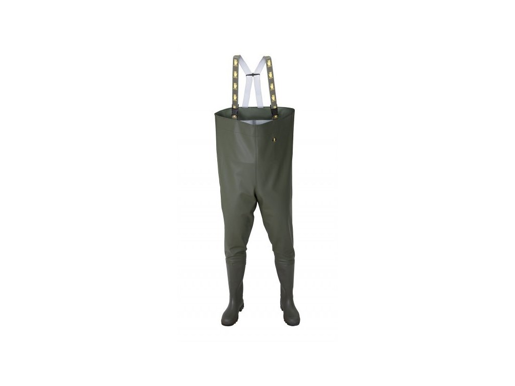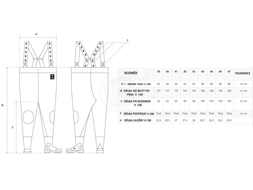 Exkluzivní brodící kalhoty s označením SB01 značky PROS, která patří mezi největší výrobce nepromokavé obuvi v Evropě. Jsou vyrobeny z originálního materiálu PLAVITEX s tloušťkou 0,7mm (zesílený PVC / Polyester) 700g / m2. PLAVITEX je extrémně odolná technická tkanina odolná vůči mechanickému poškození, která je doplněna dvojitými podlepenými švy zabezpečujícími dokonalou odolnost proti přetečení. Exkluzivitu těchto prsaček dotvářejí kvalitní boty 400P s pevnou černou podrážkou. Samozřejmostí jsou elastické šle s rychlopřezky, stahovací šňůrka na hrudi, vnitřní kapsa a také certifikát produktu splňující požadavky Evropské normy EN343 o voděodolnosti.