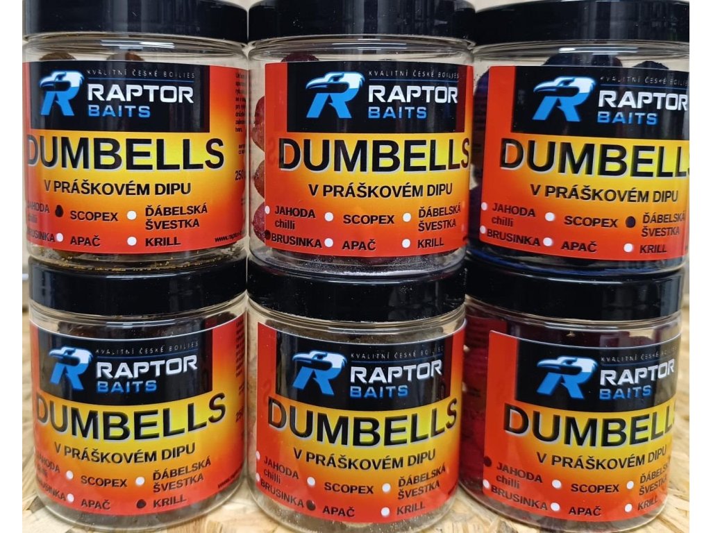 DUMBELLS – nástraha zajímavého tvaru obalená v práškovém dipu, která po vhození do vody zanechává pachovou stopu a láká ryby. Vyrobeno z čistě přírodních složek a aromat.