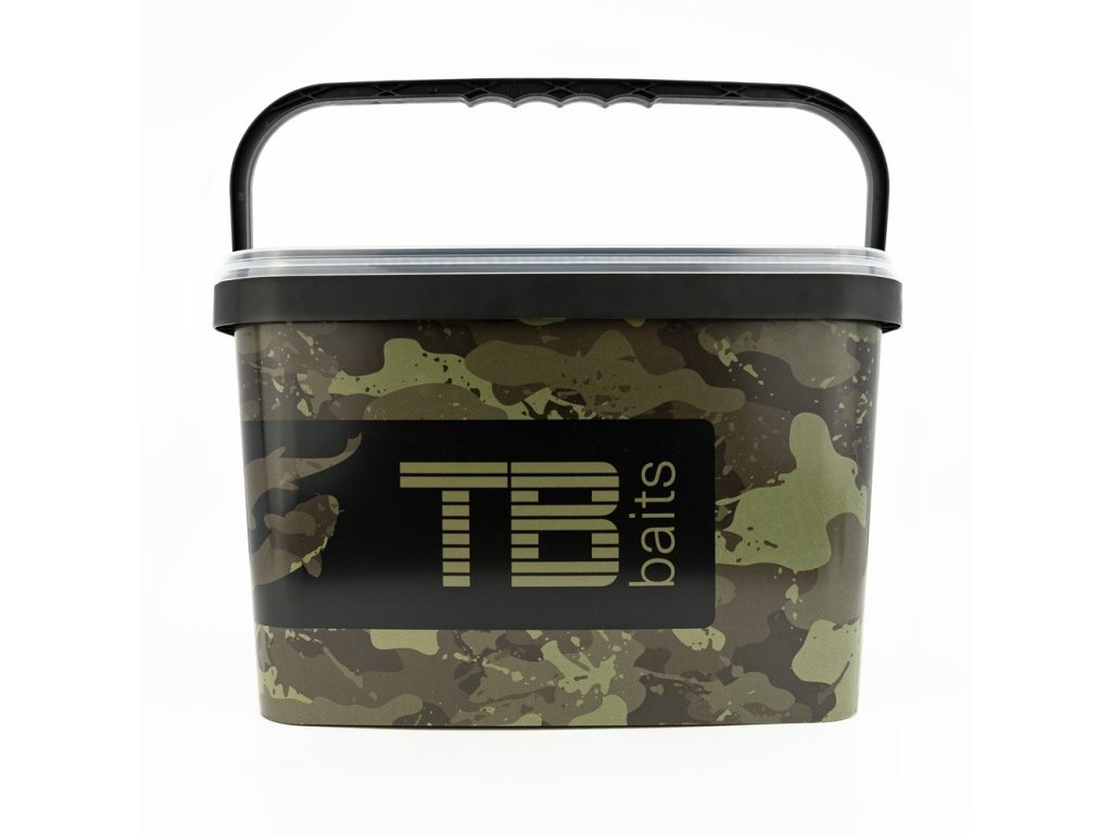 Plastový kbelík obdélníkového tvaru v designu Camo Carps od značky TB Baits.